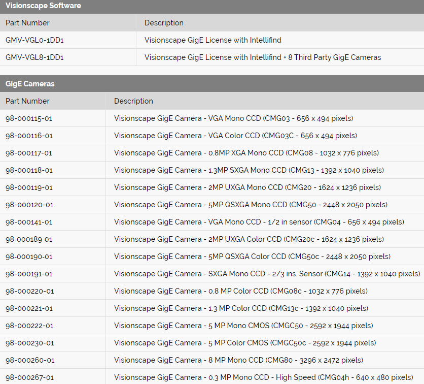 Flexible Configuration: Visionscape GigE cameras features C-mount optics, and built-in strobe and trigger connections. A wide variety of sensor resolutions are available, ranging from VGA to QUXGA (8 MP), with CMOS, CCD and color options.